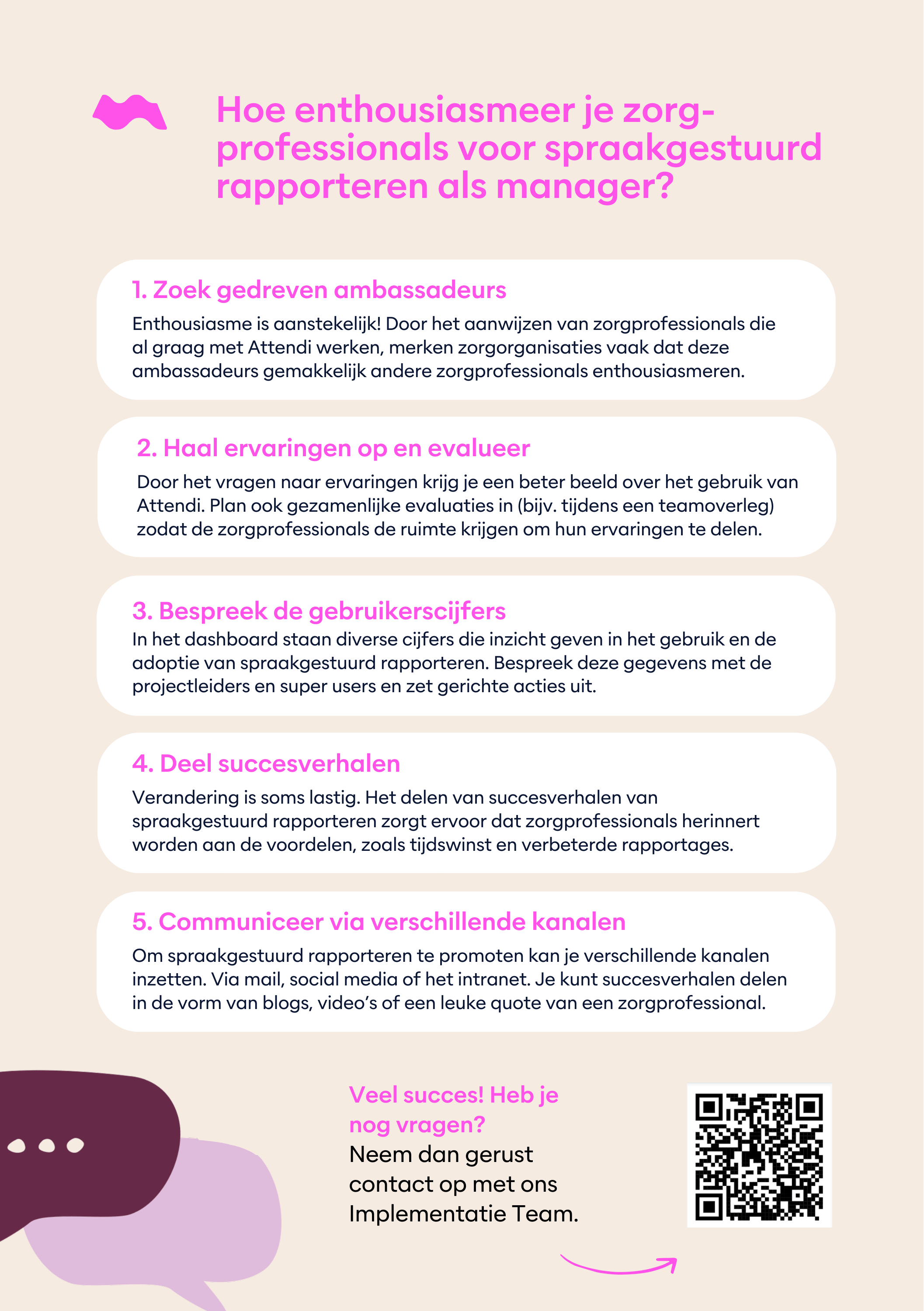 Om de implementatie en borging van Attendi te ondersteunen, is er promotiemateriaal beschikbaar dat kan helpen om medewerkers te informeren, enthousiasmeren en betrokken te houden bij spraakgestuurd rapporteren en het gebruik van de Attendi App.